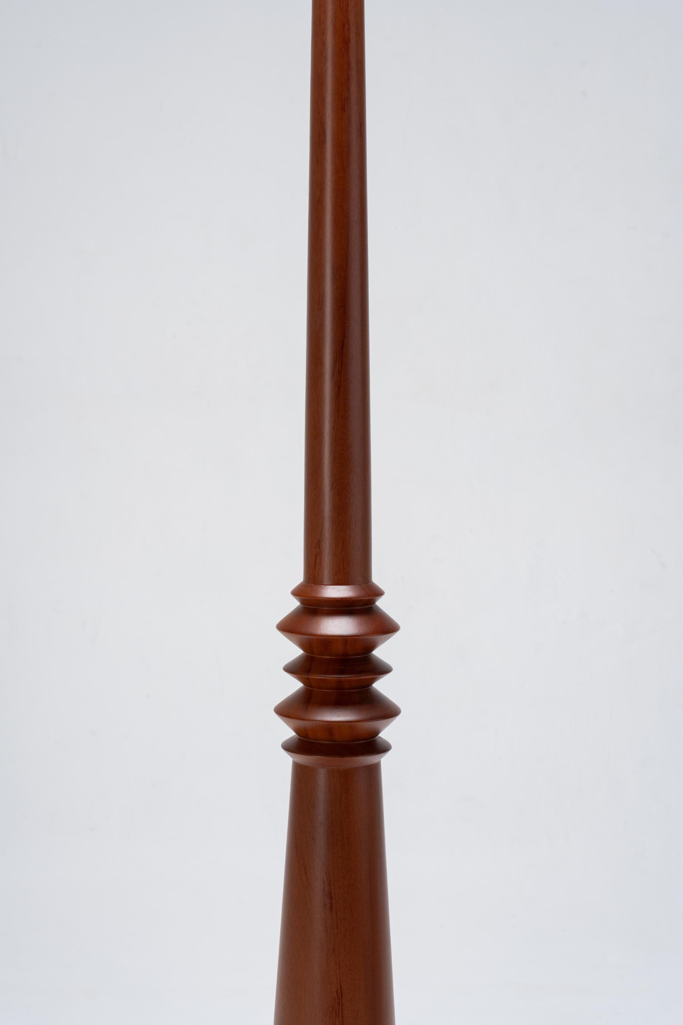 The Cocktail Floor Lamp is crafted from solid mahogany and finished in a deep Brunette tone, rich, warm, and luxuriously tactile. Its stem features a sequence of carved circular spheres, stacked like a chain of polished jewels, giving it a sculptural rhythm and a sense of movement.